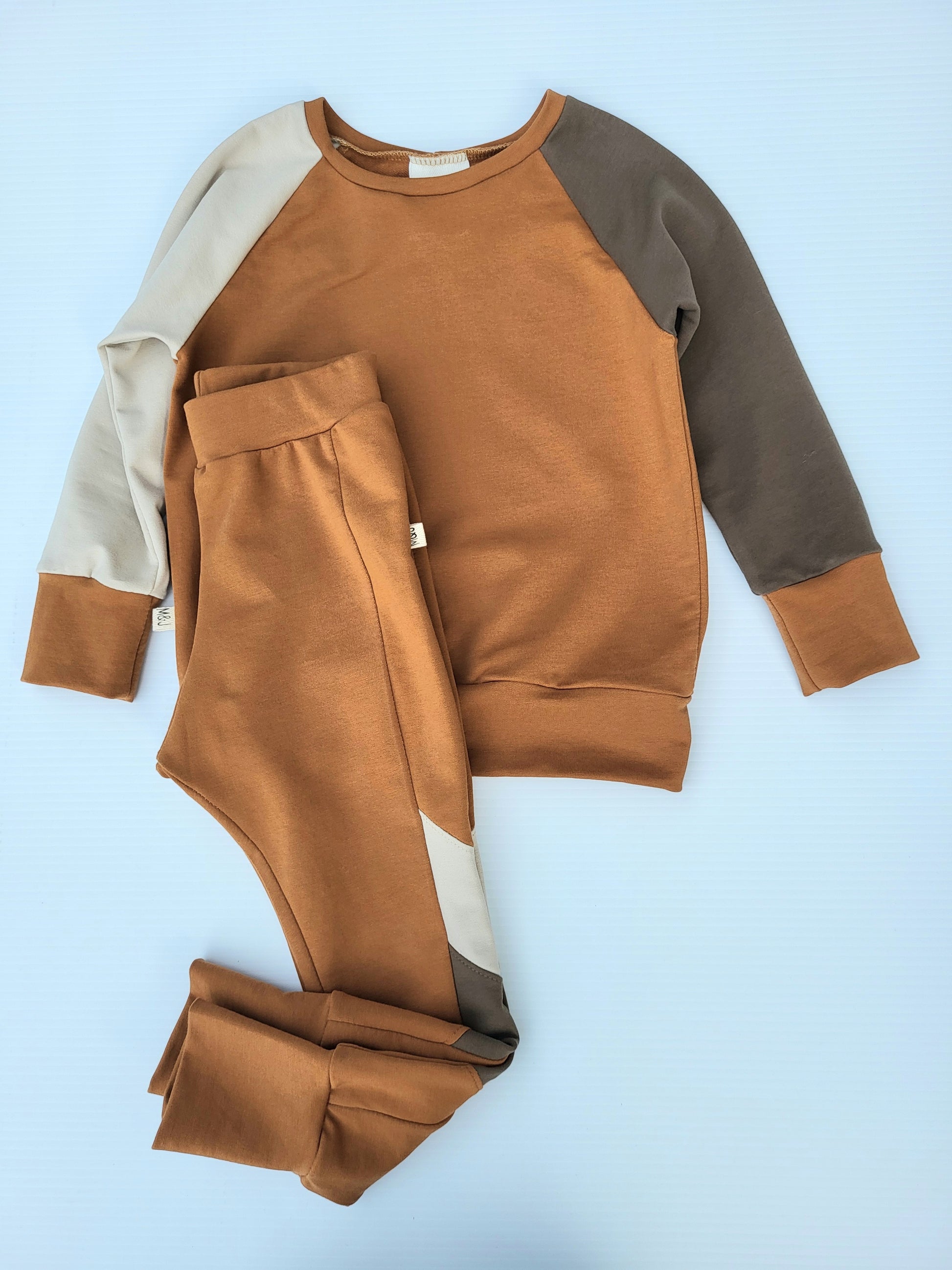 Bringing back a retro vibe in our super comfy jogging suit! Made with a french terry material, elastic waistband and color blocked top and bottoms! your little guy will love wearing it!